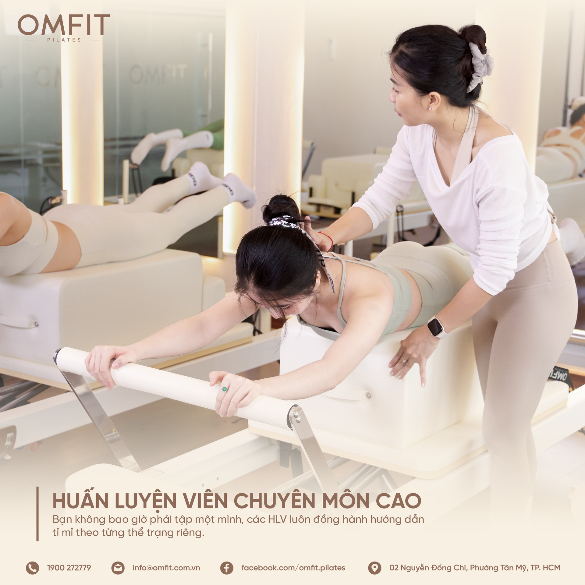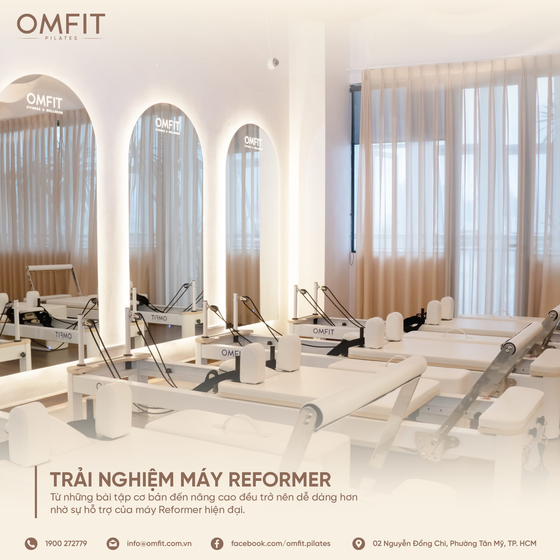 Tại OMFIT, phòng tập Pilates được trang bị đầy đủ máy móc hiện đại và không gian rộng rãi. Với không gian và ánh sáng tự nhiên, đảm bảo mang đến trải nghiệm tập luyện thoải mái và hiệu quả.