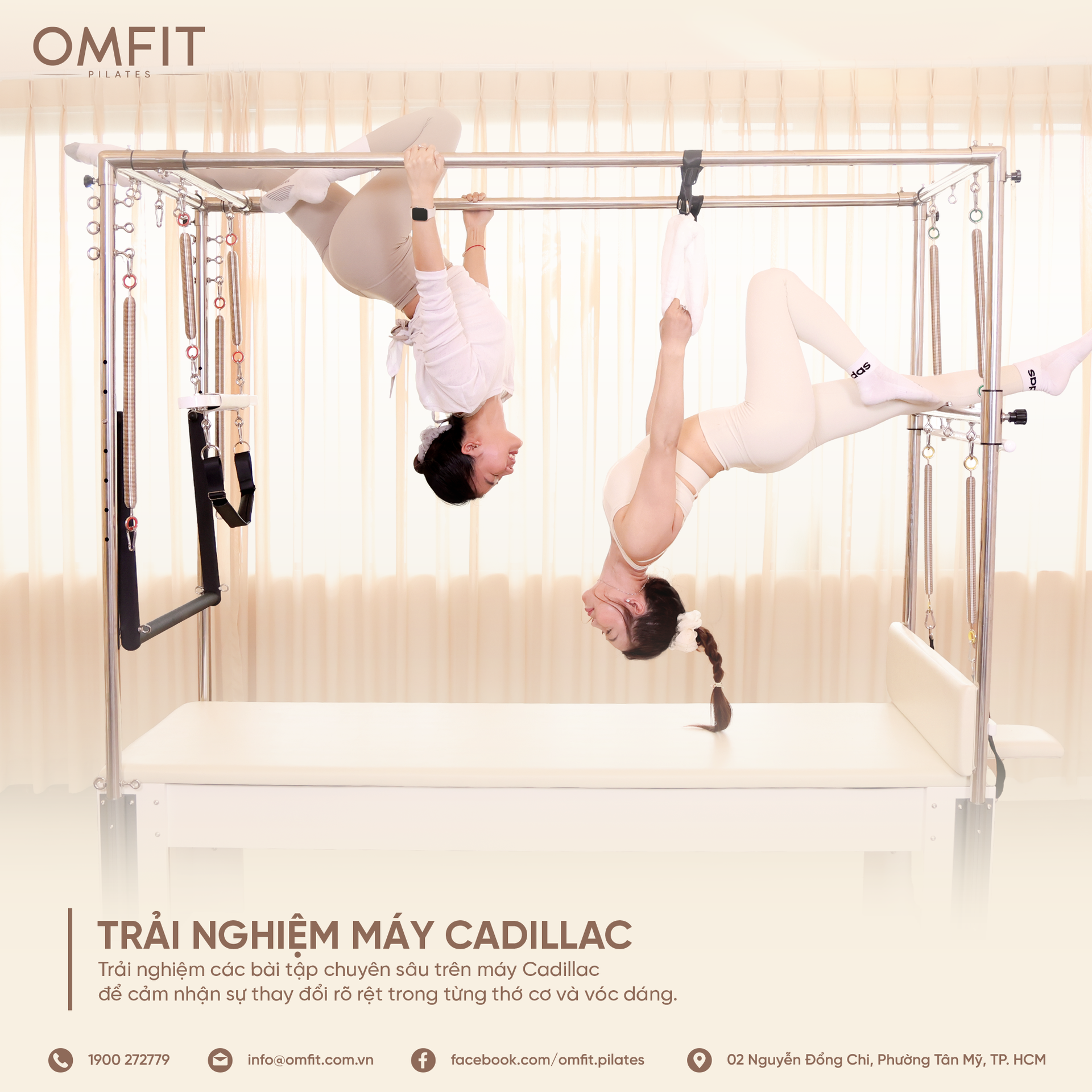 Tại OMFIT, phòng tập Pilates được trang bị đầy đủ máy móc hiện đại và không gian rộng rãi. Với sàn nhà êm ái và ánh sáng tự nhiên, đảm bảo mang đến trải nghiệm tập luyện thoải mái và hiệu quả.